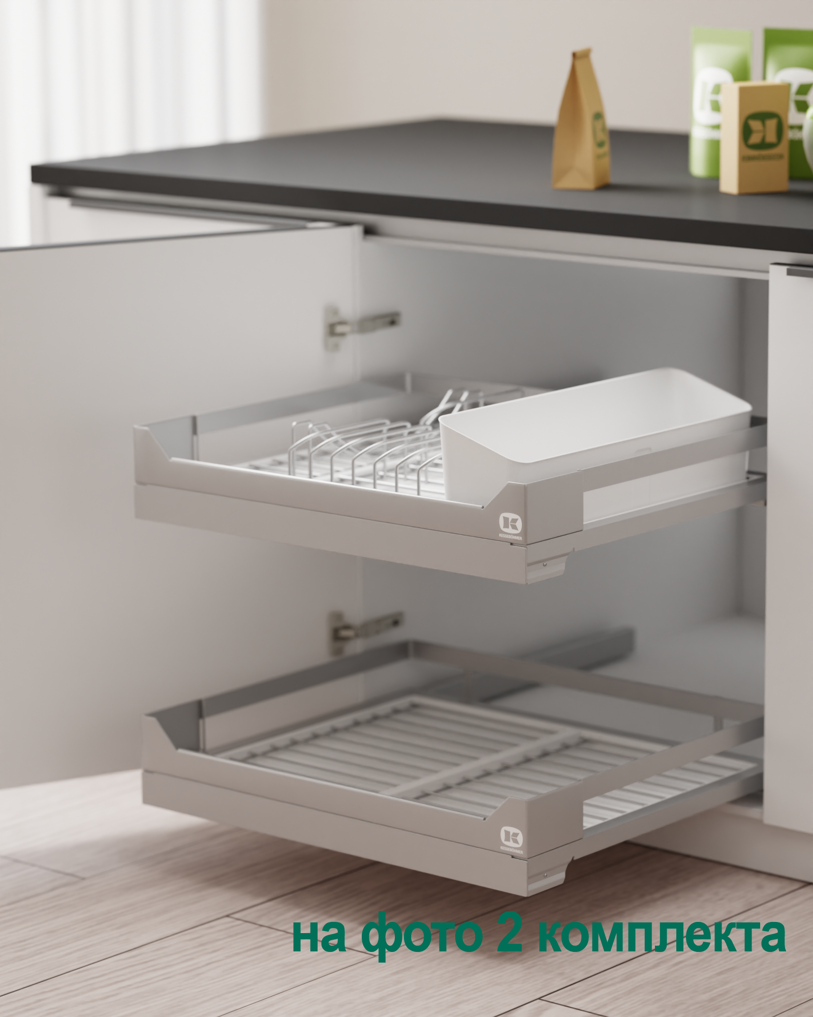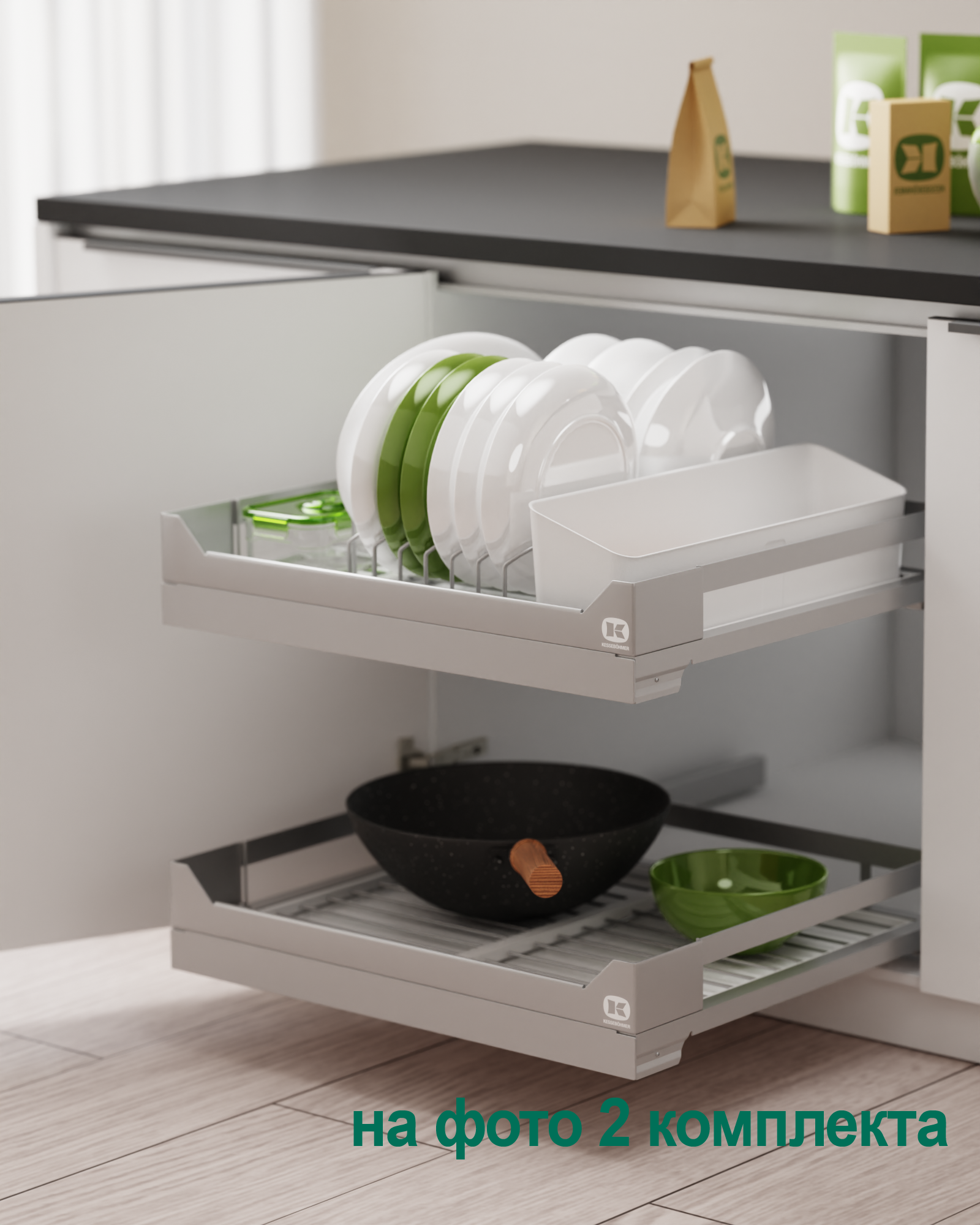 Ответ: Используйте модульную систему diningAGENT от Kesseböhmer — с полным выдвижением, возможностью мытья поддонов в посудомойке, защитой от царапин и функцией сервировочного подноса. Подходит для тарелок, блюд, чашек и столовых приборов. Доступна в цветах титан и антрацит, с доводчиком и нагрузкой до 12 кг.