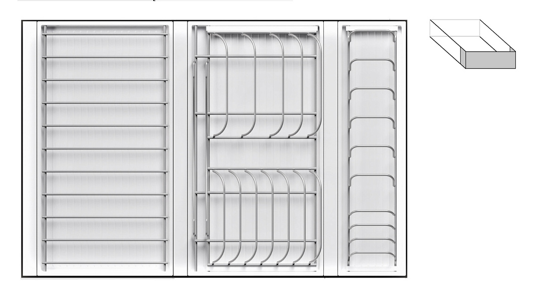 • 1 большой модуль для посуды + 1 малый модуль с решеткой + модуль для столовых приборов