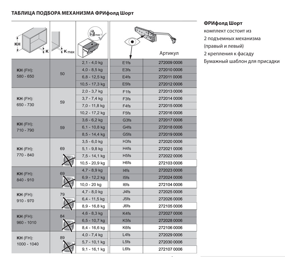 Подъемник ФриФолд Шорт E1fs H580 - 650 мм 2,1 - 3,9 кг без крышек, без петель